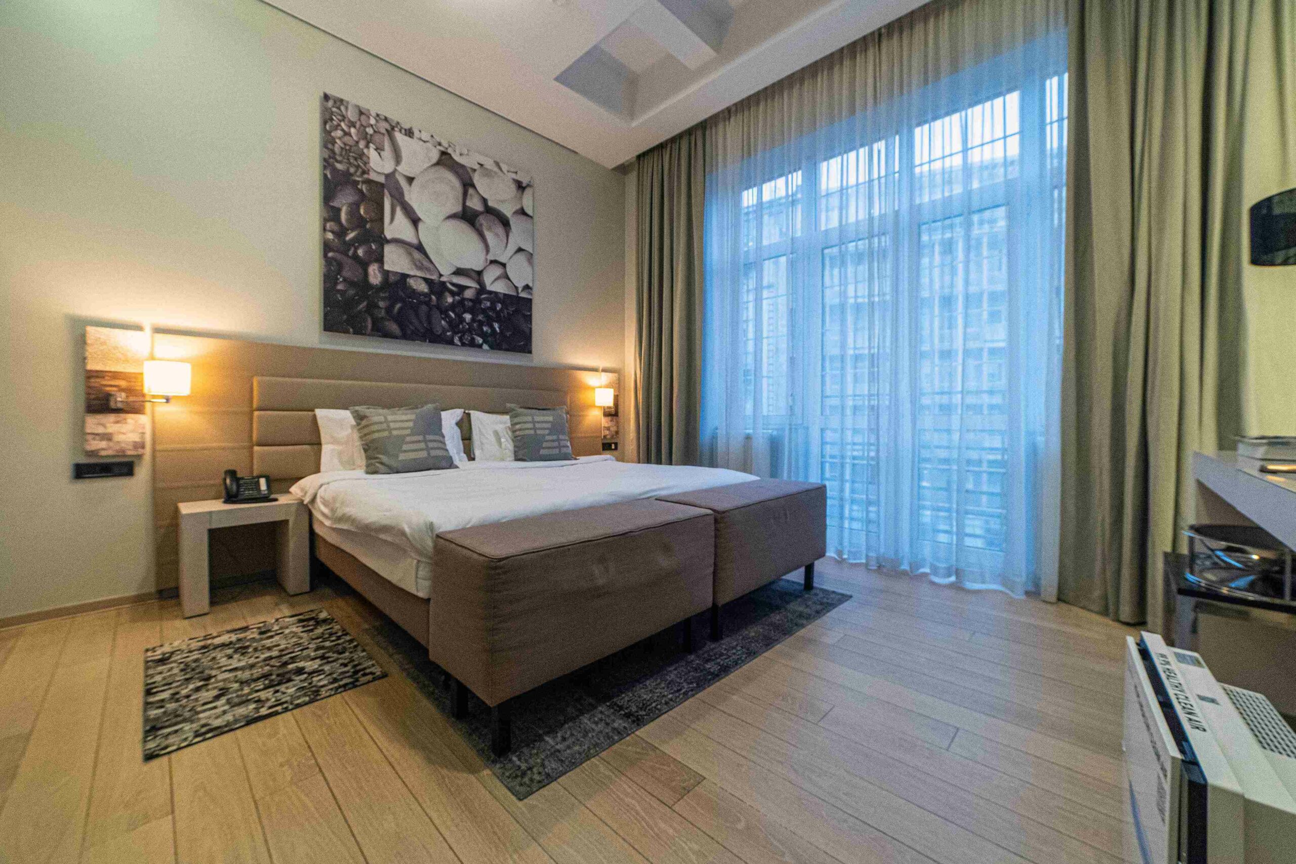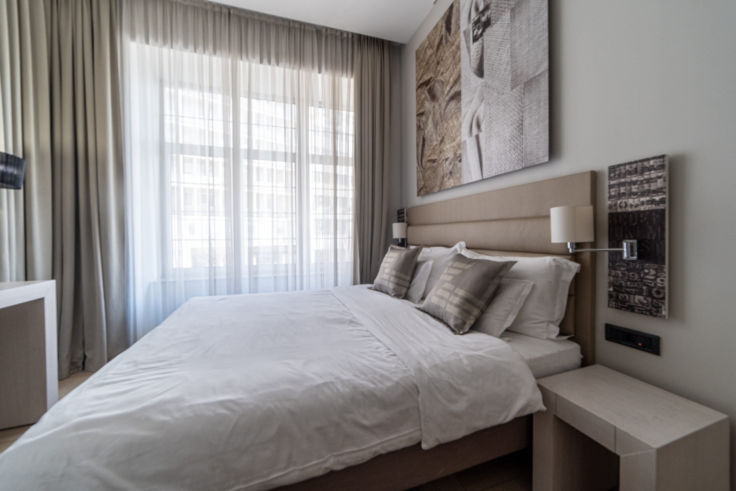 Suite ima: mini bar, klimu, WiFi, smart televizore, kablovsku televiziju, video interfon, telefon, sef, protivpožarnu zaštitu i mogućnost korišćenja protivprovalnog sistema koji reaguje na pokret. Apartman poseduje tri spavaće sobe i dnevnu sobu, dimenzije kreveta u spavaćim sobama su 160×200, 180×200, 180×240 cm, dok se u dnevnoj sobi nalazi garnitura za sedenje.